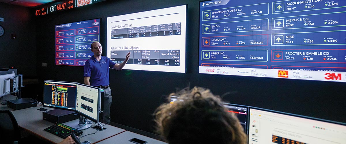 Of the students who apply to become Jaguar Investment Fund managers, the college selects 12 or 13 each semester. They enroll in Student Managed Investment Fund, a three-credit class, for a maximum of two semesters.