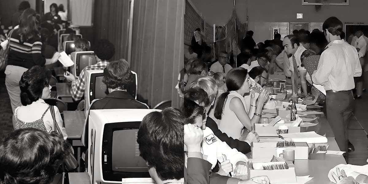By about 1980, computers began to simplify the procedure. Rows of terminals in the upstairs Ballroom at the Student Center replaced the tables. Students trained by the registrar’s office operated the machines.